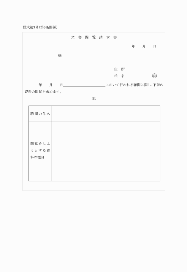 第6条 法第18条第1項、県条例第18条第1項又は町条例第18条第1項の規定による閲覧の求めは、文書閲覧請求書(様式第3号)を行政庁に提出して行うものとする。ただし、聴聞の期日における審理の進行に応じて必要となった場合の閲覧については、口頭で求めれば足りるものとする。