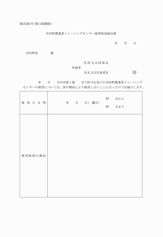 第14条 使用者がトレーニングセンター使用許可書を受理した後、トレーニングセンターの使用の取消しをしようとするときは、トレーニングセンター使用取消届出書(様式第4号)を町長に提出しなければならない。