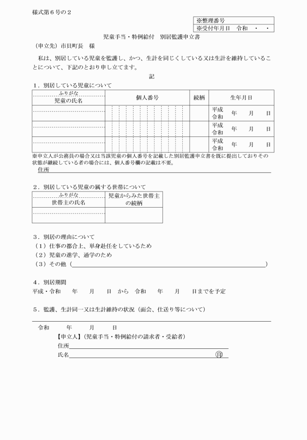 イ 請求に係る児童のうちに本町の区域外に住所を有する児童(法第3条第3項に規定する施設入所等児童を除く。)があるときは、規則第1条の4第2項第1号の規定に基づき添付される当該児童の住民票の写し又は住民票記載事項証明書であって、当該児童が世帯主である場合にはその旨、当該児童が世帯主でない場合には世帯主との続柄が記載されたもの及び同項第3号の規定に基づき添付される書類(様式第6号の2)により、児童と同居している者の状況等確認すること。