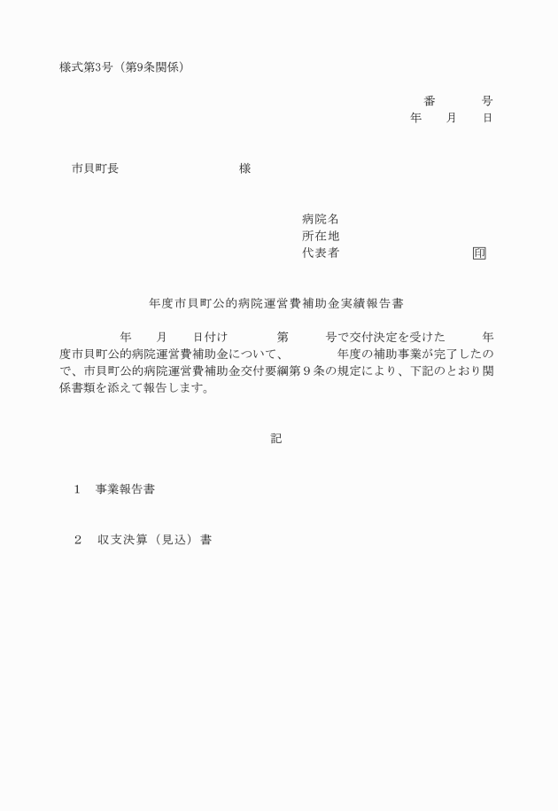 第9条 補助事業者は、補助事業が完了したとき(補助事業を中止し、又は廃止したときも含む。)は、遅滞なく市貝町公的病院運営費補助金実績報告書(様式第3号)に事業報告書及び収支決算(見込)書を添えて、町長に提出するものとする。
