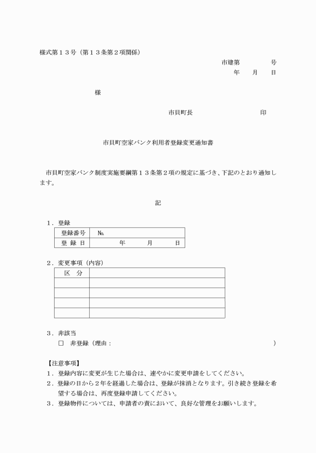 第14条 利用登録者は、物件登録制度利用の登録をやめるときは、利用登録取消届出書(様式第14号)を町長に提出しなければならない。
