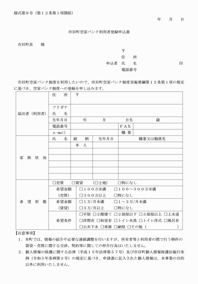第6条 空家等に関する情報を登録しようとする所有者等は、物件登録申請書(様式第1号)により、町長に提出しなければならない。
